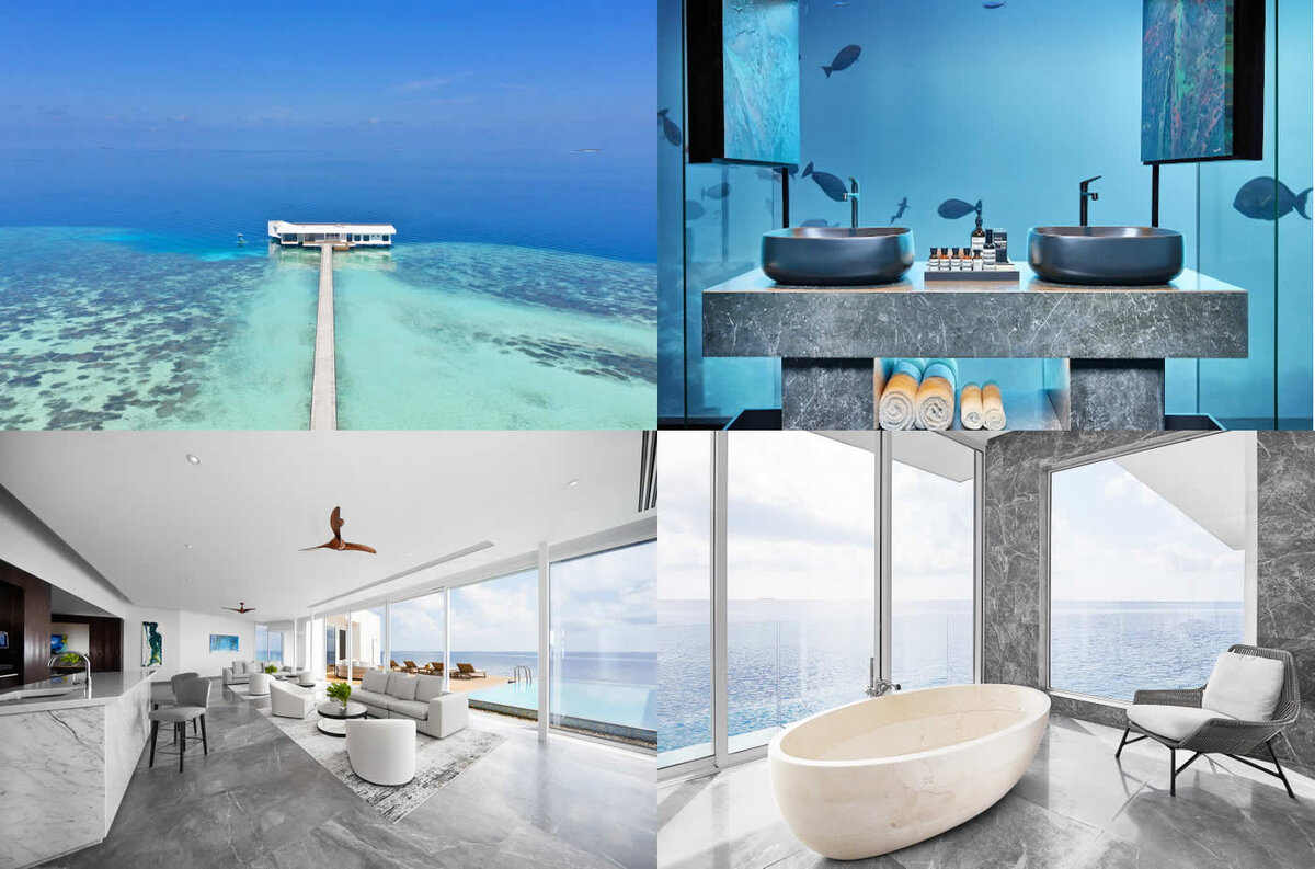 Наверху — обычная райская жизнь: гостиная с панорамными окнами, бесконечный бассейн на террасе, зона для обедов под открытым небом. Но главное чудо ждет внизу. Спуститься туда можно на лифте или по винтовой лестнице (сухим, конечно!). Добро пожаловать на глубину 5 метров. Главная спальня — это стеклянный купол. Акриловые стены от пола до потолка стирают грань между номером и Индийским океаном. Хотите романтики? Ванная комната тоже полностью прозрачна. Представляете кадры для Инстаграм?