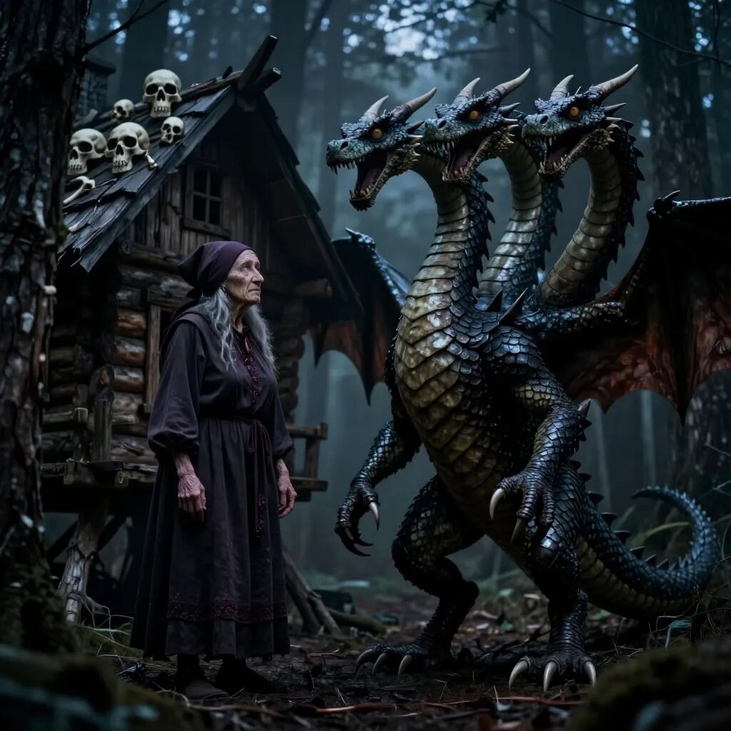 Читать ужасы на ночь «Баба Яга и змей Горыныч» Правда, скрытая в легендах В архивах краеведческого музея села Криволесье сохранилась запись 1897 года: «В ночь на 27 октября жители слышали страшный рёв над лесом. Многие видели огненные всполохи и странное свечение. Трое детей пропали без вести. Старики говорили — это Змей Горыныч вернулся, а виновата во всём старая Яга, что живёт на краю болота». Официальные власти сочли это массовой истерией, но в селе до сих пор не произносят вслух имён тех, кто столкнулся с нечистью той ночью. Осень в Криволесье выдалась промозглой. Туман цеплялся за голые ветви, а ветер носил по улицам обрывки старых песен и шёпоты забытых проклятий. Тимофей, местный лесник, возвращался домой через Криволесский лес. Он знал эти тропы с детства, но в тот вечер всё казалось чужим. Деревья склонялись над тропой, словно пытаясь схватить его ветвями-руками. В воздухе висел запах гари и чего‑то ещё — сладковатого, тошнотворного. У развилки, где тропа раздваивалась, Тимофе