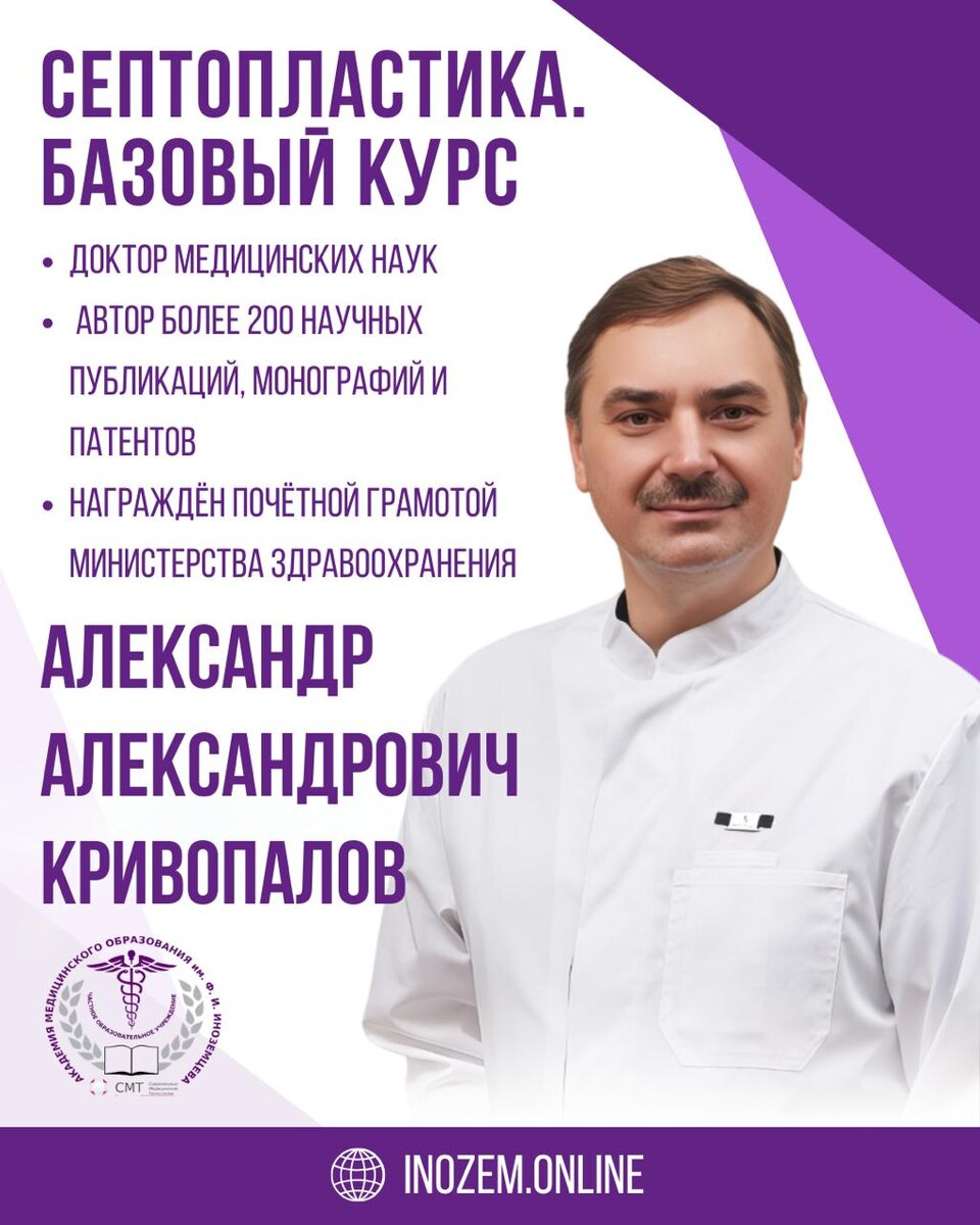 Базовый курс» До начала практического курса остается совсем немного времени. Это возможность пройти обучение в формате микро-группы и получить максимум практики в условиях реальной клинической работы. Участников ждет разбор хирургической анатомии, современные эндоскопические технологии, клинические случаи и детальное обсуждение всех этапов септопластики непосредственно в операционной. Преподаватель курса Кривопалов А.А. доктор медицинских наук, руководитель отдела патологии верхних дыхательных путей НИИ уха, горла, носа и речи. 📍 Санкт-Петербург, Клиники СМТ, пр. Римского-Корсакова, 87/21 📅 26 марта с 14:00, 27 марта с 13:00 💰 Стоимость участия: 56 000 ₽ Количество мест строго ограничено: в группе только 4 участника. Если вы планировали участие, рекомендуем забронировать место заранее. 📲 Контакты: +7 (812) 334-76-50 +7 (812) 244-65-24 📩 akademuy@yandex.ru