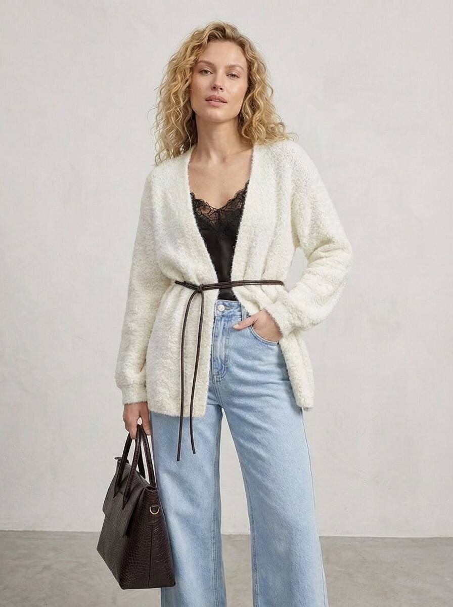 Мягкий кардиган молочного оттенка, кружевной топ глубокого шоколадного цвета и свободные джинсы wide leg — сочетание фактур, которое всегда