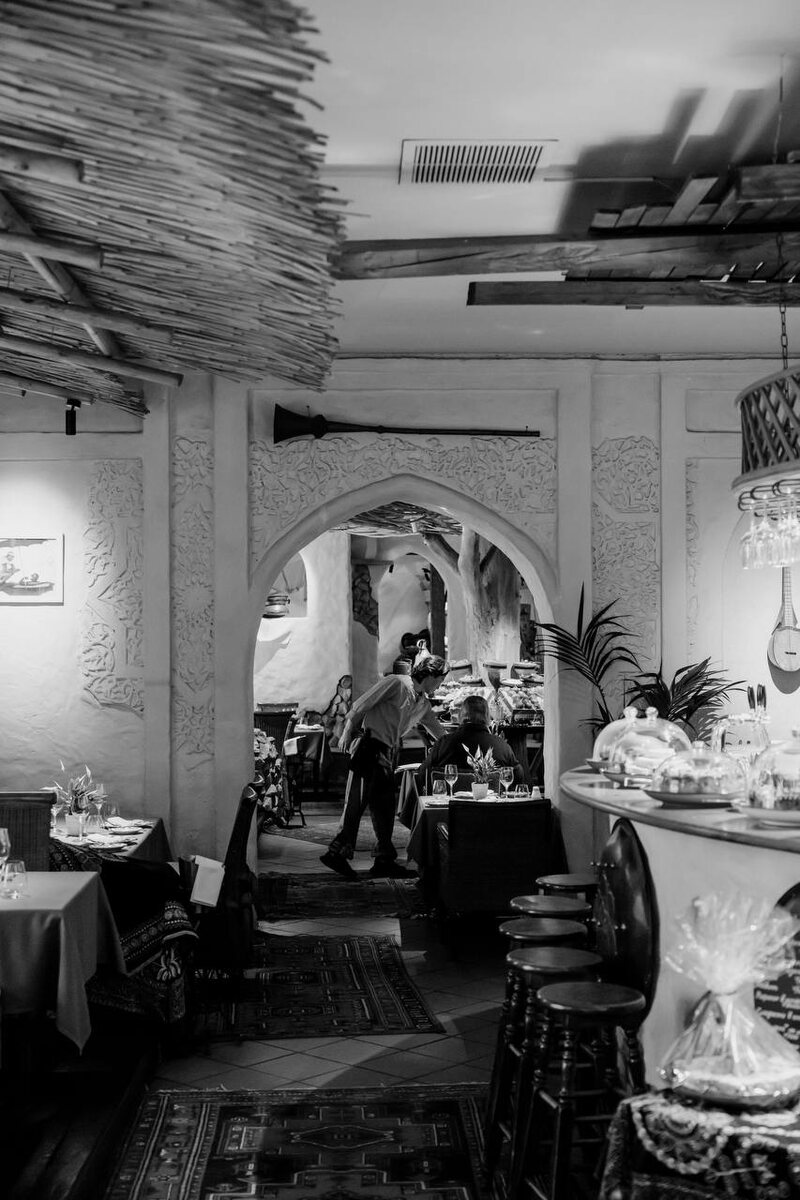 Ресторан «Белое солнце пустыни», где атмосфера словно переносит гостей прямо в культовый фильм. Открытый Аркадием Новиковым в 1997 году, он стал настоящим рестораном-цитатой легендарной картины «Белое солнце пустыни». Интерьер наполнен деталями из фильма: кадры со съемочной площадки, куклы главных героев, уникальные фотографии и автографы режиссёра Владимира Мотыля — давнего друга и почетного гостя ресторана. Особая деталь пространства — арыки с живой стерлядью, где гости могут выбрать рыбу, которую повара приготовят по фирменным рецептам. А в теплый сезон открывается уютная веранда с видом на Неглинную улицу и внутренний дворик.