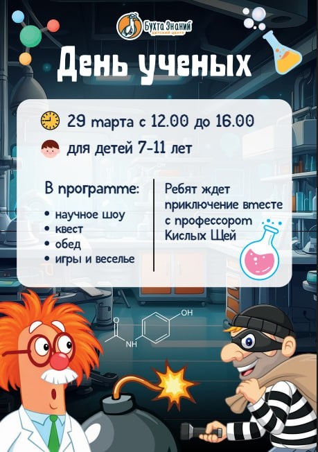 ! 29 марта ребят ждет приключение вместе с профессором Кислых Щей. Согласно легенде, профессор Кислых Щей — знаменитый учёный, открывший немало удивительных тайн📎 Однако у него есть один недостаток — рассеянность, которым часто пользуются злоумышленники. Они регулярно крадут его ценные секреты.😭 Сейчас профессор снова оказался в затруднительном положении: неизвестные похитили его самый важный ингредиент — порошок собранности и концентрации. Теперь злодеи угрожают уничтожить этот ценный компонент, чтобы никто больше не смог воспользоваться его силой. Именно поэтому профессор обращается за помощью к нашим юным исследователям, и просит спасти его открытие 🧐 Ваше первое задание — поучаствовать в захватывающем квесте и обезвредить заложенную злоумышленниками бомбу! Мероприятие пройдёт 29 марта в «Бухте Знаний» с 12:00 до 16:00 (без выезда) Ребят ждёт насыщенная программа с полным погружением: ✔️ Квест и обезвреживание бомбы ✔️ Шоу научных экспериментов от приглашенного героя - пр