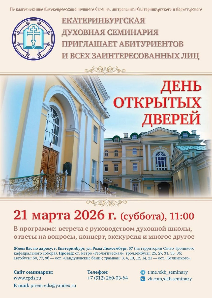 – В этот день мы познакомим будущих студентов с администрацией и профессорско-преподавательским составом, расскажем об особенностях учебного процесса, направлениях подготовки и правилах приема на предстоящий учебный год, – рассказали в духовной школе. —Приглашаем всех, кто желает связать свою жизнь со служением Церкви и получением духовного образования! В программе: ✔официальная встреча с руководством семинарии, ✔консультации по вопросам поступления, ✔экскурсионная программа, ✔выступление певческих коллективов семинарии. Место встречи: г. Екатеринбург, ул. Розы Люксембург, 57, 2 этаж, актовый зал Контакты: +7 (343) 311-99-40, +7 912 260-03-64, priem-eds@yandex.ru