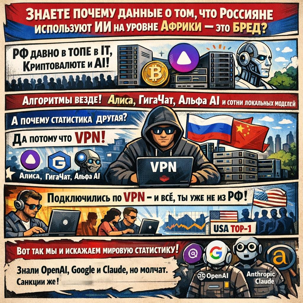 ? РФ достаточно давно занимает серьезный кусок в IT, Криптовалюте и в использовании AI (кстати есть свои достаточно мощные модели, а ведь стран у которые есть свои модели не так много). И тут бац степень внедрения AI на уровне Африки!? Ну бред же, у нас все кому не лень сейчас в бизнес внедряет AI, он сейчас по всюду, хоть пользователь может и не знать этого. Много локальных open source моделей развернутых на серверах и использующихся в крупном бизнесе, есть куча своих наработок. Практически каждая компания из списка топ-100 имеет свои сервера с нейросетями и многое делает через них. Есть публичные крупняки Алиса и Gigachat, есть спец. решения Alfa Ai например. Короче куча всего, но есть еще важный нюанс, большинство игроков на рынке юзают зарубежные модели через VPN. А раз VPN, то и пользователь не из РФ. Вот так считай мы искажаем международную статистику, как раньше искажали и искажают пользователи из Китая на VPN. Так уж получилось, что если смотреть топ по пользователям на