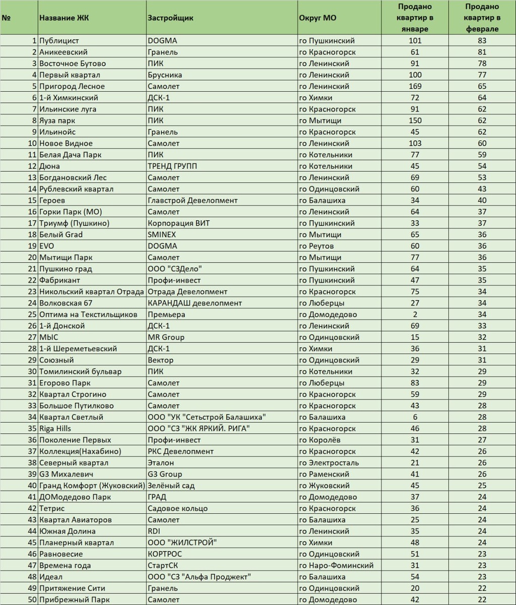 ТОП-50 самых продаваемых ЖК Подмосковья — февраль 2026