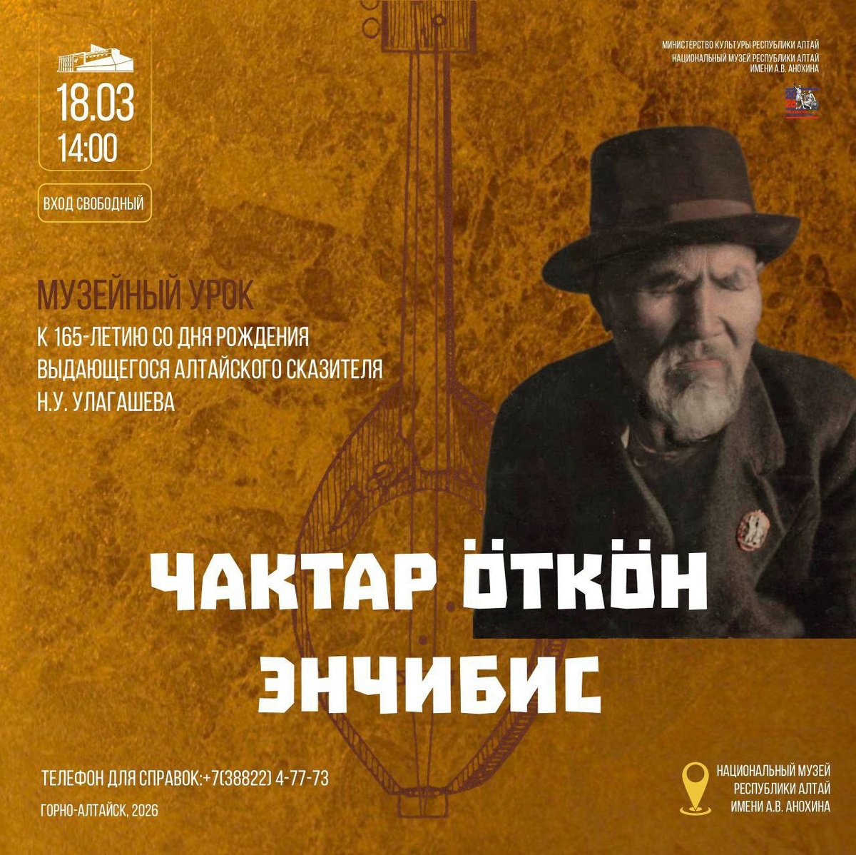 У. Улагашева. Гости узнают о жизни и эпическом наследии легендарного кайчы. Сотрудник музея расскажет, почему его роль так важна для алтайского народа. 📍Когда: 18 марта в 14:00 Вход свободный.