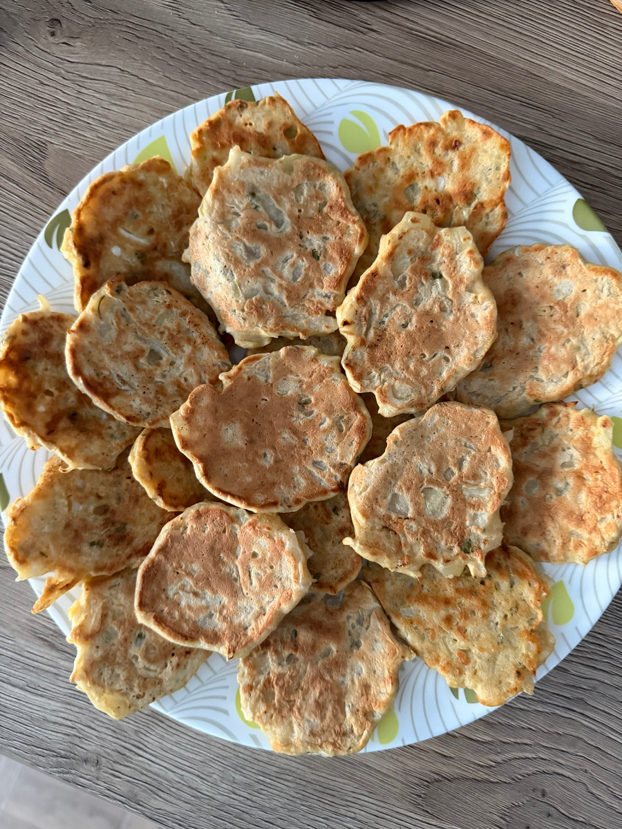 Жарить с двух сторон на топленом масле на очень медленном огне, чтобы капуста и лук успели приготовиться и стать мягкими