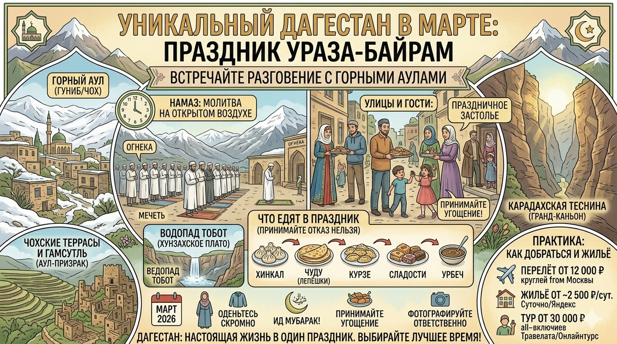Большинство туристов планируют Дагестан на лето — июль, август, море, горы. И почти никто не думает о марте. Зря. В конце марта 2026 года в республике происходит кое-что, чего не увидеть ни в какой другой сезон: горные аулы встречают Ураза-байрам — праздник разговения, которым завершается священный месяц Рамадан.