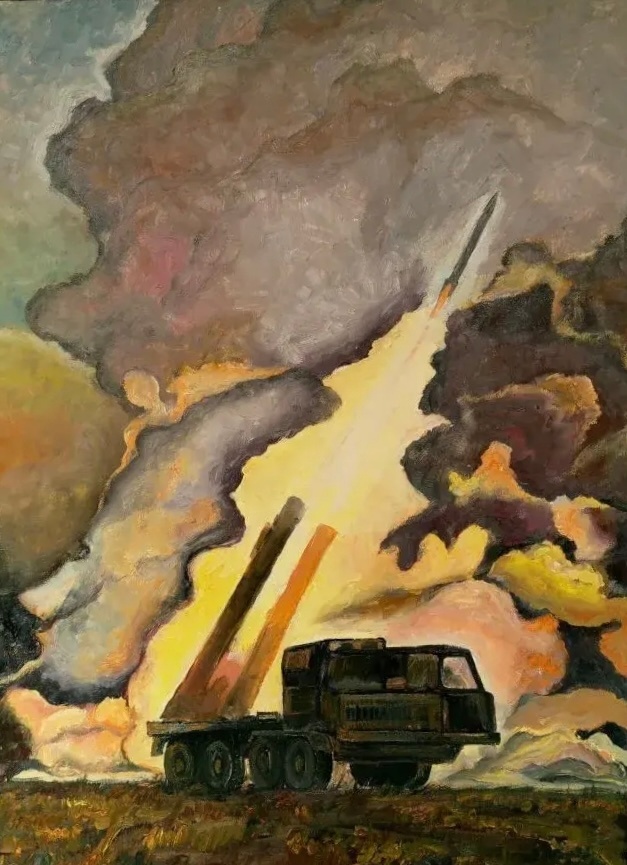 Сейчас идёт совсем другая война. Художники не стоят под пулями. Нет уже больше баталий – только дроны, ракеты, сетки, небо, разорванное «Сонцепёком». Но на выставке это единичные случаи, когда художник увлекается эффектами красок как закатом. В основном работы лиричны и психологичны.