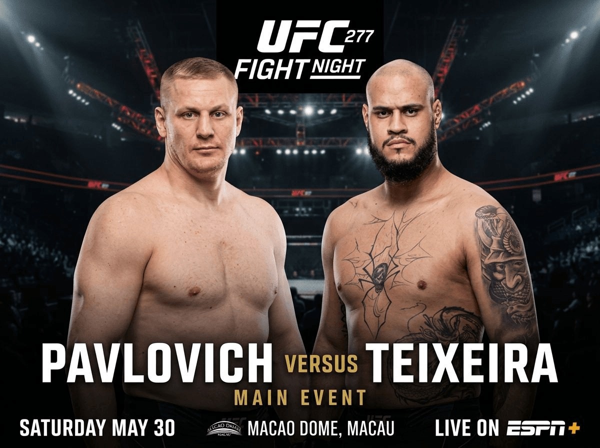 Российский тяжеловес, один из самых грозных нокаутеров дивизиона, Сергей Павлович готовится вновь выйти в октагон. Следующее появление уроженца Ростовской области в клетке состоится уже в конце весны. Официальные представители UFC подтвердили информацию, которую бойцы и фанаты обсуждали последние недели: Павлович выступит на турнире UFC Fight Night 277. Ивент, который станет настоящим подарком для любителей ММА в Азии, пройдет 30 мая в Макао — специальном административном районе Китая, который уже не раз принимал элитные бойцовские шоу. Российскому тяжеловесу будет противостоять опасный бразильский проспект Таллисон Тейшейра. Для 26-летнего Тейшейры это бой станет важнейшей проверкой на прочность. Ворвавшись в элиту промоушена, бразилец успел продемонстрировать нестабильный, но яркий характер. В своем дебютном поединке он без проблем разобрался с ветераном Джастином Тафой, отправив его в технический нокаут. Однако затем последовало серьезное испытание грозным нокаутером Дерриком Льюисо