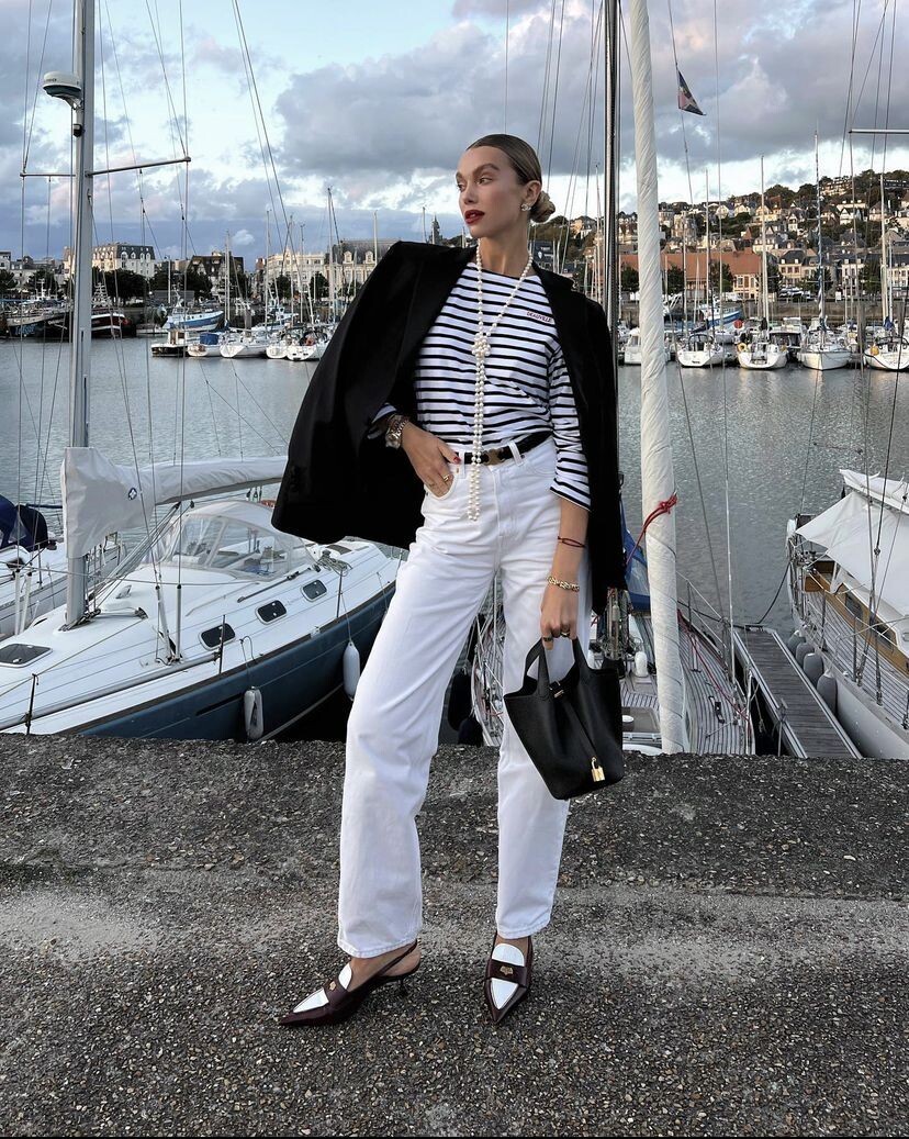 Знаете этот образ, от которого веет морским ветром, солью и дорогим отдыхом, хотя человек просто вышел за хлебом? Белая рубашка, синий пиджак, полоска, соломенная сумка. Вроде ничего особенного, а смотрится так, будто только что сошла с яхты в Сен-Тропе.