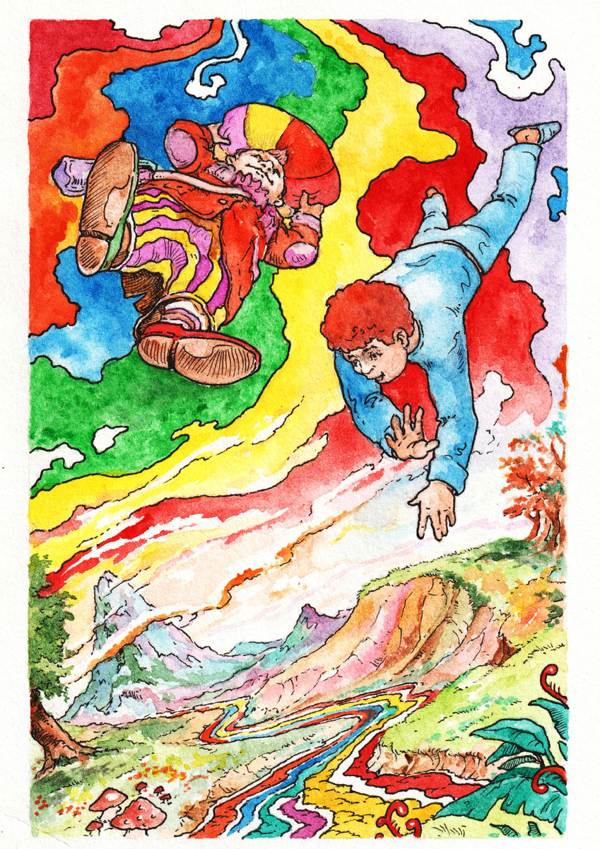 Венина комната расцветилась тысячей радуг и Веня со Спиридоном как будто взлетели – по крайней мере так показалось Вене. Мальчик сперва зажмурился, но потом всё же открыл один глаз из нестерпимого любопытства. Вокруг бушевали радужные бури – огромные разноцветные облака сталкивались друг с другом, наползали друг на друга, растворялись друг в друге. Сверкали зелёные, красные и фиолетовые молнии и гремел цветной гром.