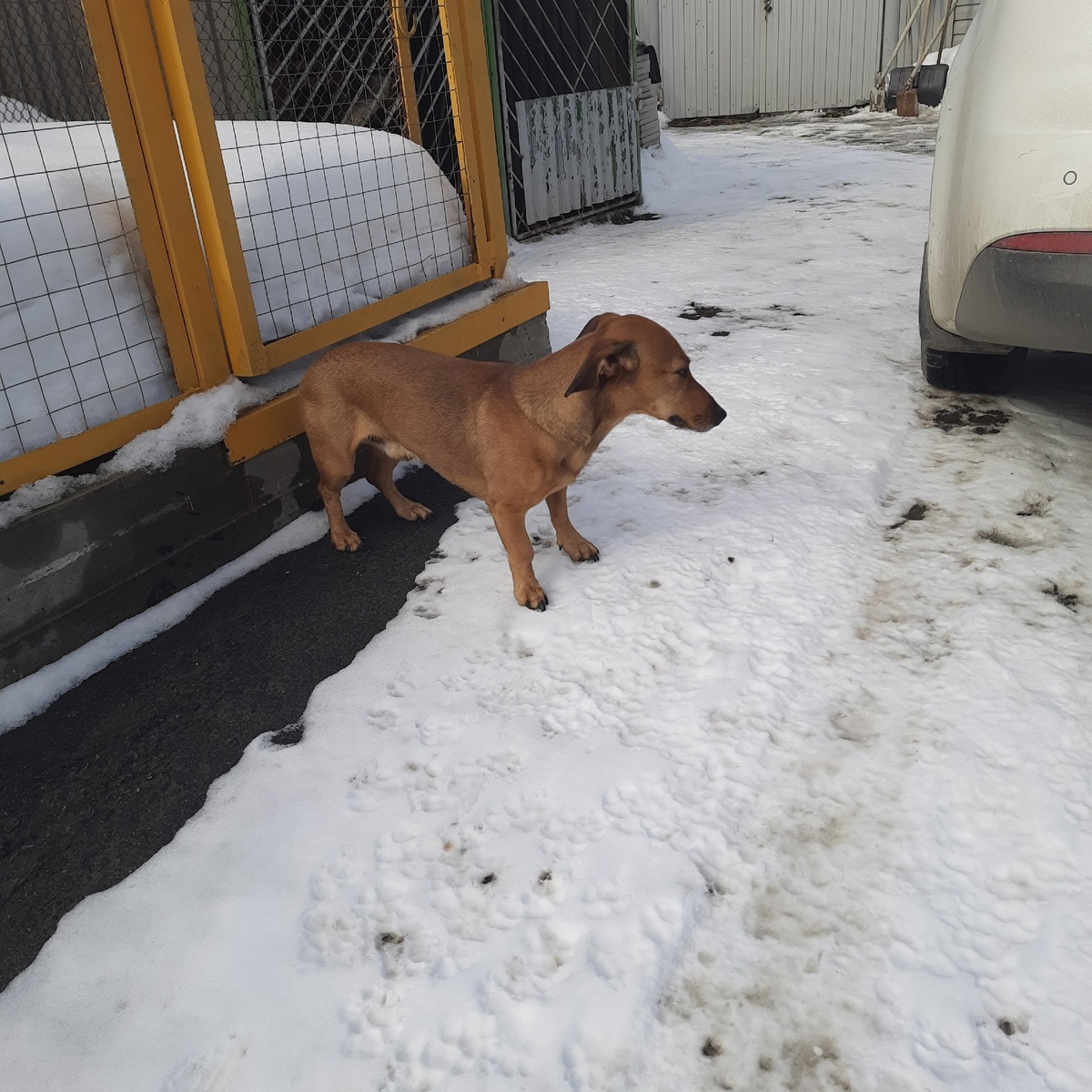 Чей пёсик, похож на таксу, целый день не уходит с одного места, дрожит всем телом, но не уходит. Съел сосиски.