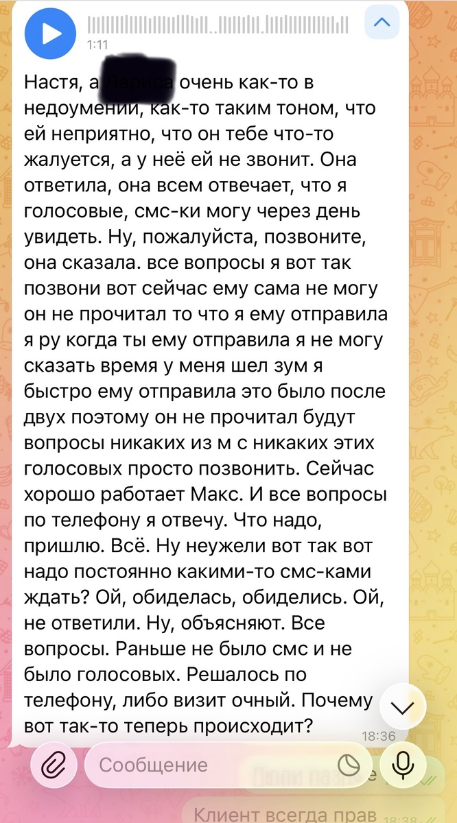 Сработала его травма. Где-то в прошлом у него закрепилось: «Если за мной не бегают, значит, я не важен». Он ожидал, что Наталья будет ему звонить, лично объяснять, держать за ручку. В бизнесе, в большом бизнесе, такого нет. Невозможно бегать за клиентом, потому что этих клиентов сотни. Чатов в телефоне, в телеграме, в любом другом мессенджере — тоже сотни. Если тебе не отвечают на сообщения, это не значит, что к тебе относятся без уважения. Это значит, что твоё сообщение просто не было первым.
