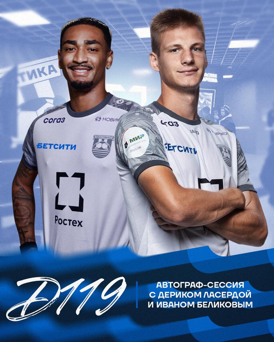 ✍🏻 Балтийцы, в этот раз автограф-сессия у нас будет двойной! Ваня Беликов и Дерик Ласерда, который очень хочет исправиться за свою оплошность, будут ждать вас в зоне «Ростех» на D119 с 18:15 до 19:15! ❗️ Напоминаем, что гейты стадиона начнут свою работу в 17:30. Приходите заранее, чтобы избежать очередей! 🎟️ БИЛЕТЫ