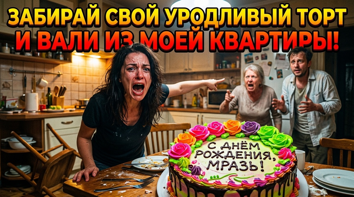 — Забирай свой уродливый торт и проваливайте из моей квартиры! — чеканя каждое слово, произнесла Марина. — Оба. Прямо сейчас.
