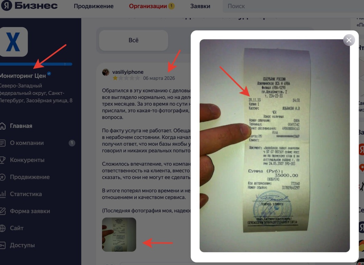 Картах. Нам в xmldatafeed.com написали отзыв. Мол пришли и заказали парсинг, ничего не получили. Приложили чек. На покупку. От 2013 года, а нас тогда еще не очень существовало. Причем сам чек даже не на оплату, а на взнос наличных кассиру в банке :) в городе Пермь. Вот так бывает... Кто это делает? Да хз, есть наверное обиженки, которые мелко гадят... И Яндекс такой отзыв не удалит. @clickfraud.ru