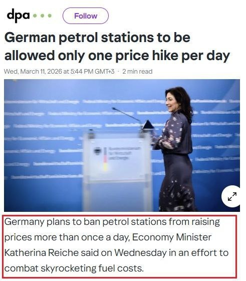 Правительство Германии по примеру Австрии введёт правило, согласно которому повышать цены на горючее можно будет только раз в день. Такая практичность, как считают в кабмине ФРГ, поможет обуздать галопирующий рост стоимости бензина и солярки Так, впервые с 2022 года цена за литр самого бюджетного бензина превысила отметку в €2, а дизельное топливо местами продают по €2,70. К слову, 90% грузов в Германии перевозят именно дизельные автомобили, однако правительство просит ещё немного потерпеть Кризис – понимать надо! А ещё и Украину нужно поддерживать, как обещали @geonrgru | 🇷🇺 MAX | sponsr.ru