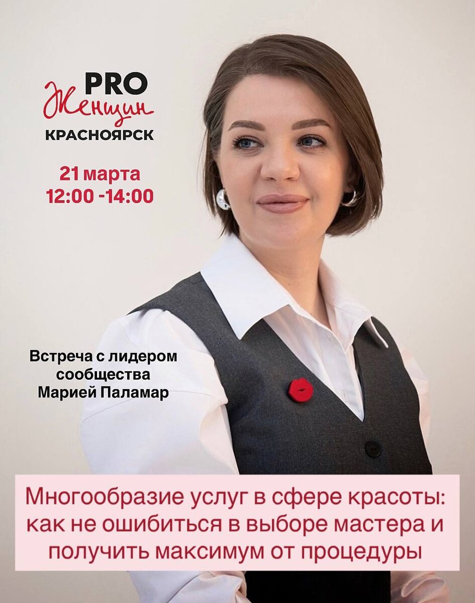 !🌺 Приглашаю вас на теплую встречу, где мы поговорим о главном секрете удачного преображения 😶🌫️ Многообразие услуг в сфере красоты: как не ошибиться в выборе мастера и получить максимум от процедуры! Меня зовут Мария Паламар, и в сфере красоты я работаю уже 🥱😮💨лет! На встрече мы разберем все по полочкам: ♦️Море услуг: что реально нужно вам, а что просто модный тренд? ♦️Поиск «своего» мастера: существует ли формула идеального специалиста? ♦️На что смотреть в профиле и на первой консультации? Встреча пройдет в кругу единомышленниц в рамках ценностей сообщества PRO Женщин ❤️ 🥳Дата: 21 марта (суббота) 😶Время: 12.00-14.00 😟Место: Центральный район, на уточнении Участие бесплатное, но количество мест ограничено. Поэтому необходима запись. Для записи пишите в личные сообщения ➡️ @pm_palamar ⬅️ Сообщество PRO Женщин свободно от политики, религии и продаж! Все мероприятия сообщества безоплатны! Поддержите сообщество и мероприятие: ➡️поделитесь этим постом с друзьями в ваших с