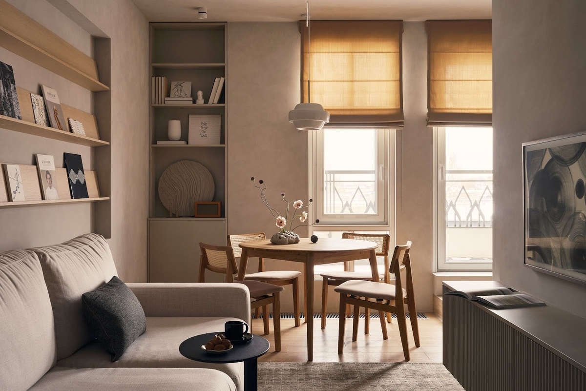 Искусство, комиксы и винил — эта квартира наполнена творчеством. Здесь спокойные серые тона формируют теплую и уютную атмосферу, помогая раскрыть индивидуальность хозяев через интерьер. Владельцы этой квартиры — молодая семья с ребенком. Супруги увлекаются масштабными моделями Лего, собирают редкие книги, винил и винтажную посуду. Ультрасовременный дизайн и холодный минимализм плохо вписывались в их представления об уюте, поэтому в основу интерьера легла стилистика джапанди. В ходе перепланировки в квартире особое внимание уделили хранению — выделили полноценную гардеробную, предусмотрели множество ниш, стеллажей и полок. Это решение позволило скрыть ряд недостатков планировки: скошенные откосы на окнах, высокий порог на балкон, неудобные выводы под вентиляцию и массивные стояки в санузлах. Кухню и гостиную разделили на два отдельных пространства — между ними возвели стену. В прихожей теперь есть естественный свет: в ходе ремонта демонтировали перегородку, которая стояла на одной оси с
