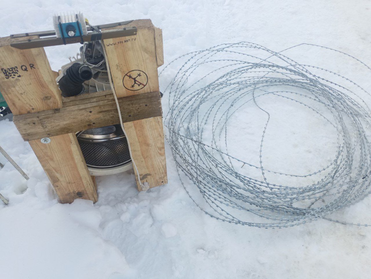 Устройство до безобразия простое и представляет собой две точки крепления, одна из которых является приводом, а другая просто вращается на подшипнике. Между ними натягивается колючая проволока "егоза", которая дополнительно проходит через вилки-подпорки, чтобы исключить провисание. Когда на вращающуюся проволоку попадает оптоволокно, оно зацепляется колючкой и перерубается. Вроде бы всё здорово, но не всё так просто. Во первых, девайс этот собирается в том месте, где проходят "трассы" пролёта БПЛА, что само по себе небезопасно. Во вторых, после потери буквально нескольких дронов, противник соображает, что тут дороги нет и начинает летать по другому маршруту, а значит всю эту хрень нужно перетаскивать и устраивать засаду другом месте. В третьих, внезапно это всё работает на электричестве, как минимум от АКБ или от ближайшего "гены". Так как генераторы не под каждым кустом лежат, то выходит, что не в каждом месте можно установить такой агрегат. Кстати привет тем, кто рассуждал, что "его