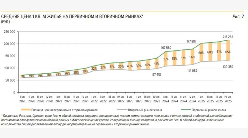 По данным Банка России, в четвертом квартале 2025 года он составил 65% — 215 тысяч (первичка) против 130 тысяч рублей (вторичка). Однако, по оценке регулятора, разрыв настолько большой, потому что с новостройками сравнивают вторичные дома, построенные более 40 лет назад. А следует сопоставлять их на рынке готового жилья с похожими по характеристикам жилыми комплексами.