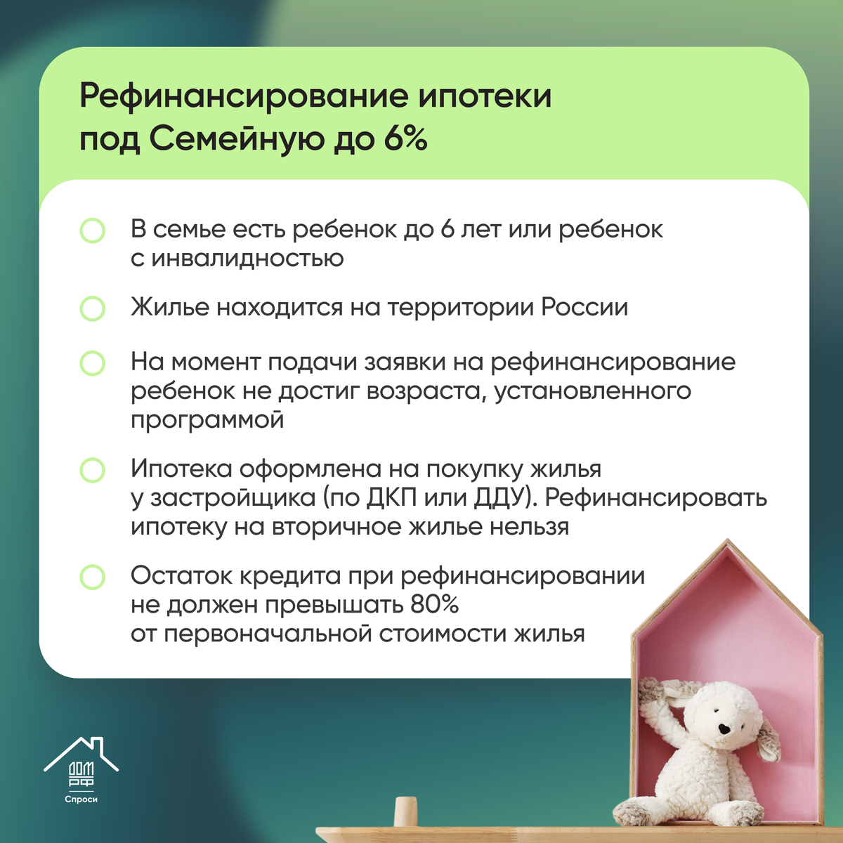 🧸 Действующий ипотечный кредит можно рефинансировать под Семейную ипотеку до 6% годовых при определенных условиях