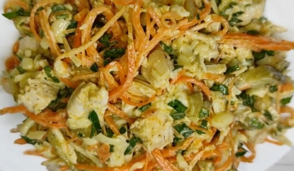 Салат «Лисичка» с курицей, сыром и корейской морковкой готов.