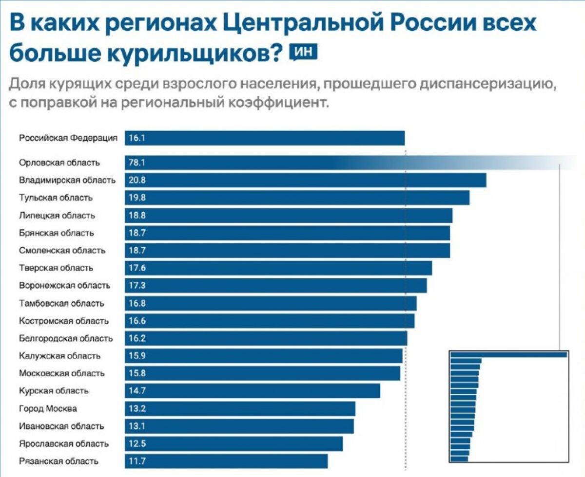 Минздрав России опубликовал данные о распространенности вредных привычек среди взрослого населения. По данным «Ивановских новостей», доля курящих жителей во Владимирской области составляет 20,8%. Этот показатель был рассчитан на основании данных диспансеризации с учетом региональных коэффициентов. В рейтинге 33 регион занял вторую строчку. На первой расположилась Орловская область с показателем 78,1%. На третьем месте оказалась Тульская область (19,8%). Список замкнули Рязанская (11,7%), Ярославская (12,5%) и Ивановская области (13,1%).
