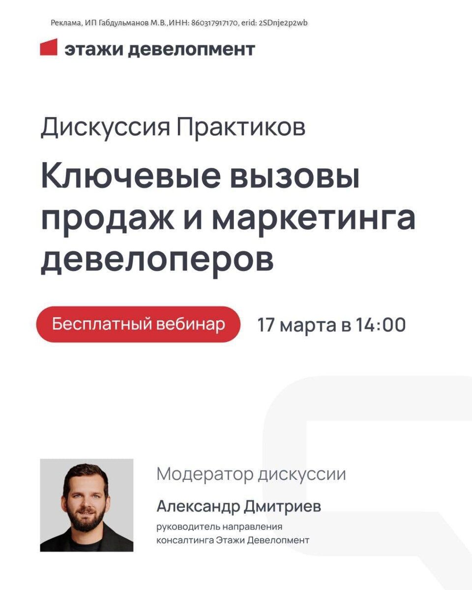 девелоперами, и как их эффективно преодолевать. В фокусе обсуждения: 🔴стратегия продаж и логика ценообразования; 🔴связь продуктовых решений и коммерческого результата; 🔴работа с агентским каналом; 🔴эффективность инструментов сбыта; 🔴роль брендинга в успешности проекта; 🔴лидогенерация и её окупаемость. Формат — профессиональный диалог с разными точками зрения, обмен мнениями и опытом, без очевидной теории. 👨👩👦👦Спикеры — управленцы с опытом в продажах, маркетинге и продукте. 🗣Когда: 17 марта, 14:00 Мск. Участие бесплатное, но важно предварительно зарегистрироваться ➡️здесь. Ссылка на трансляцию придёт в день дискуссии на почту, указанную при регистрации. Если вам важно разобраться в актуальном состоянии рынка и получить работающие решения — рекомендуем вам прийти на дискуссию!