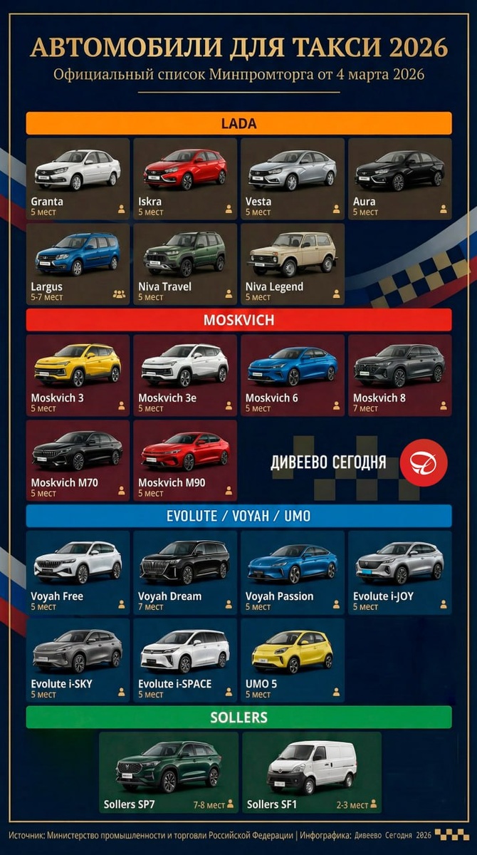 В связи с этим Минпромторг опубликовал обновленный перечень автомобилей, допущенных к работе в такси. Согласно принятому документу, к работе в такси допускаются только автомобили, имеющие высокую долю российских компонентов или произведенные в рамках специальных инвестиционных контрактов (СПИК). Актуальный перечень разрешенных автомобилей В настоящее время в список включены следующие модели: 🚖 Lada: Granta, Iskra, Vesta, Aura, Largus, Niva Travel, Niva Legend 🚖 Sollers: SP7, SF1 🚖 Evolute: I-JOY, I-SKY, I-SPACE 🚖 Voyah: Free, Dream, Passion 🚖 Москвич: 3, 3е, 6, 8,М70,М90 🚖 UMO: 5 Кроме того, Минпромторг финализирует нормативную базу для расширения списка. Соответствующий акт уже внесен в правительство: ожидается включение моделей бренда Haval (Jolion, F7, F7x), а также Tenet T7.