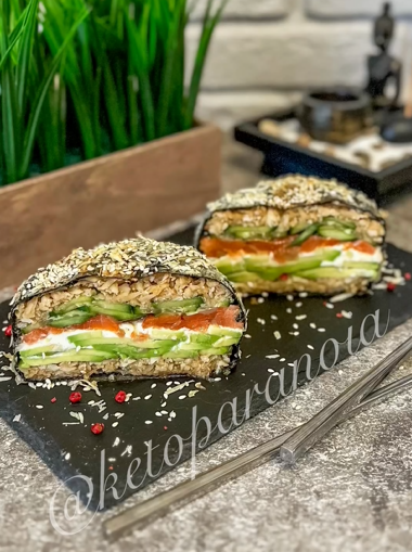 Очень жду от вас 🤎🤎🤎 и обратную связь 💬, ведь я для вас очень стараюсь! Встречайте гастрономическую сенсацию - суши-бургер в КЕТО варианте! Вместо булки - аппетитные «рисовые» диски (их полезная альтернатива), а внутри взрыв вкусов: нежная рыба, сливочный сыр и сочные овощи. Готовы попробовать Японию «на вкус» в новом формате? Автор 🎥 ketoparanoia Состав: 🥬Цветная капуста 100 г 🍣Лосось слабосоленый 50 г 🧀Крем чиз 50 г (любой творожный, сливочный сыр) 🥒Огурец 40 г 🥑Авокадо 30 г 🥄Листы нори 2 шт 🧀Пармезан 30 г 🥚Яйцо 1 шт 🥄Соевый соус 2 ст л 🥄Кунжут 5 г 🧈Масло для жарки 5 г Приготовление: 1 Цветную капусту натереть на тёрке или измельчить в блендере. Обжарить на масле до полуготовности, с добавлением специй, или использовать в сыром виде. 2 Огурец, авокадо, рыбу нарезать тонкими слайсами. Пармезан натереть на мелкой тёрке. 3 На стол положить лист нори, по центру установить кондитерское кольцо (диаметр 10 см). 4 Наполнить кольцо в следующем порядке: - цветная капуста (утра