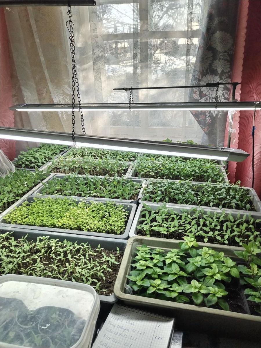 Многие ставят рассаду на солнечный подоконник и считают, что этого света достаточно. Нет, дорогие мои! Недостаток освещения - это не только вытягивание рассады, это еще и не вовремя заложенная первая кисть. Закладка первой кисти происходит еще во время развития семядолей, и если в этот период растению будет недоставать света, вместо закладки первой цветочной кисти произойдет закладка очередного листа, и растение будет закладывать листья до тех пор, пока не решится проблема с освещением: может, солнце станет светить ярче, а день станет длиннее. Некоторые рекомендуют в первые две недели круглосуточное освещение, но в моём случае ночное освещение это еще и опасно, поэтому 12-15 часов достаточно. У меня обычно 12-13. Обычные лампы дневного света 36 вт вполне себе справляются с дополнительным освешением рассады. Всем хорошего урожая❤