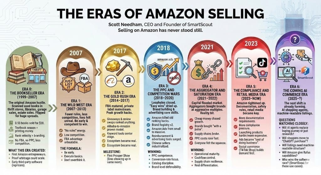 Недавно Scott Needham (CEO SmartScout — лучший софт для рисерча Амазон) выложил вот такую инфографику. Я не буду все ее переписывать, вы сами читать умеете. Если кратко, то раньше было лучше и трава была зеленее. Нам важно, что происходит сейчас и что будет дальше. Вы же знаете эту фразу: — лучшее время для выхода на Амазон было вчера, второе лучшее время для выхода на Амазон — сегодня. Вот прикиньте сколько всего нужно сделать для запуска: анализ ниши, товар найти, общение с фабрикой, договоры, контракты, переводчики, дизайнеры, аналитики, реклама... Всех их искать, всеми управлять, платить. Вы были на апворк? Видели там качество? Ну боль ведь. Я абсолютно ответственно заявляю, что AI при правильном использовании сделает эти все задачи лучше, чем 90% специалистов. Конечно, топовые исполнители едят свой хлеб не зря, но в большинстве случаев нас устроит решение на 4 с минусом, быстрое и дешевое. Вот что я думаю по поводу будущего и того, как маленькие селлеры будут продавать: 1