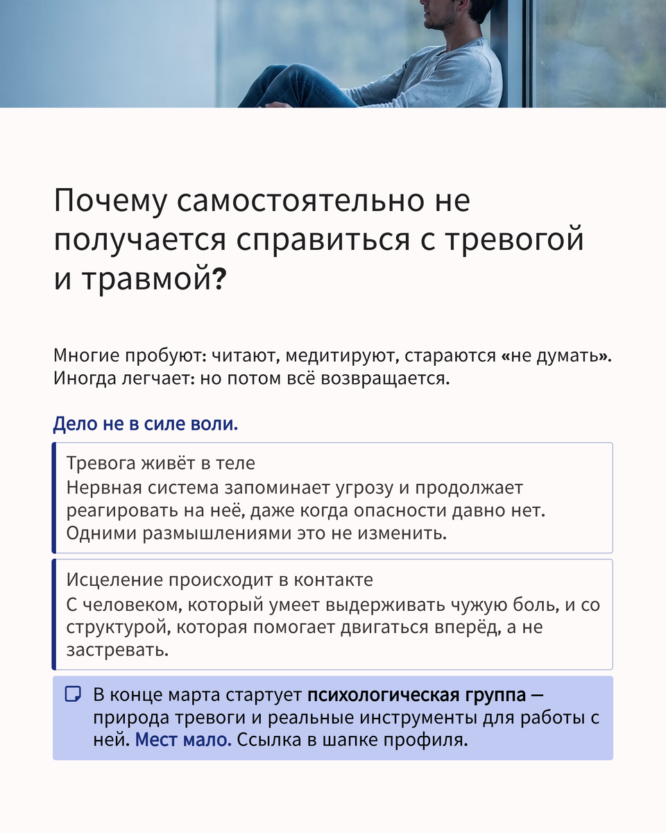 В марте стартует психологическая группа, хотите разобраться с тревогой, переходите по ссылке - https://t.me/+uP8Qy3KDXTplZTc0
