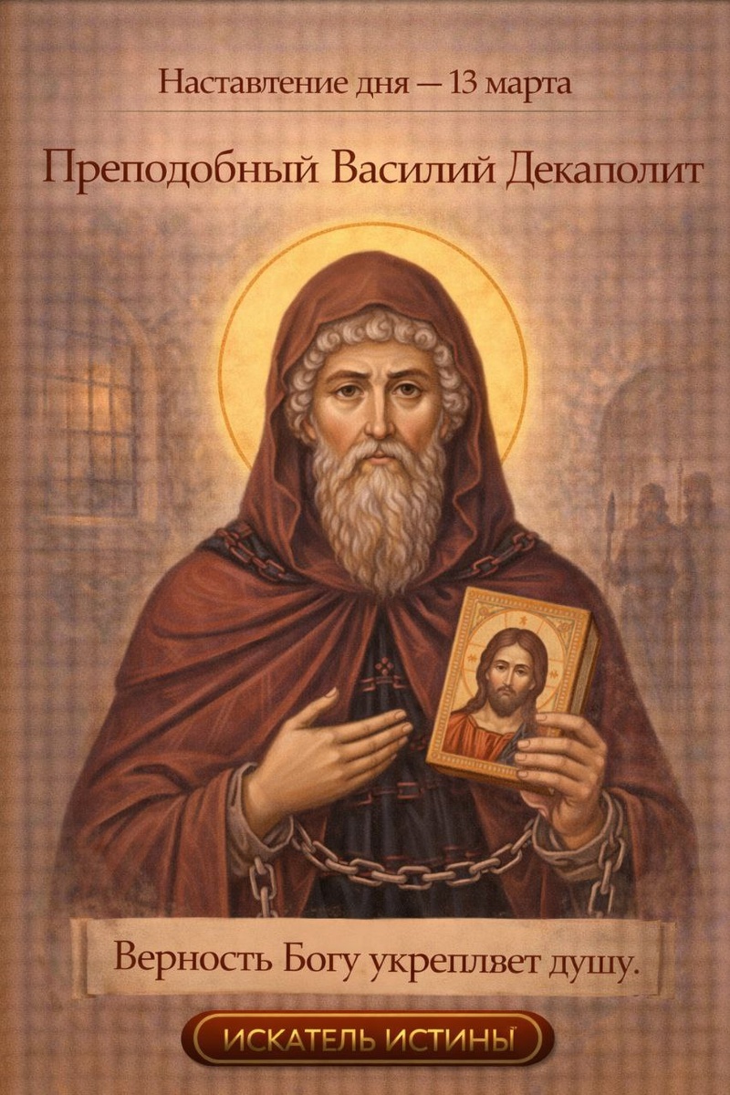 Преподобный Василий Декаполит В этот день Церковь вспоминает преподобного Василия Декаполита — подвижника, который посвятил свою жизнь молитве, посту и защите православной веры. Святой Василий жил во времена иконоборческих гонений. Когда почитание святых икон было запрещено, он открыто исповедовал православное учение и не соглашался отказаться от истины. За верность Церкви преподобный был подвергнут заключению и страданиям. Однако испытания не поколебали его духа. Он сохранял твёрдость веры и продолжал служить Богу. Жизнь святого показывает, что истинная духовная сила проявляется в верности истине и готовности переносить трудности ради Христа. Память преподобного Василия напоминает нам: верность Богу требует мужества, терпения и постоянства.