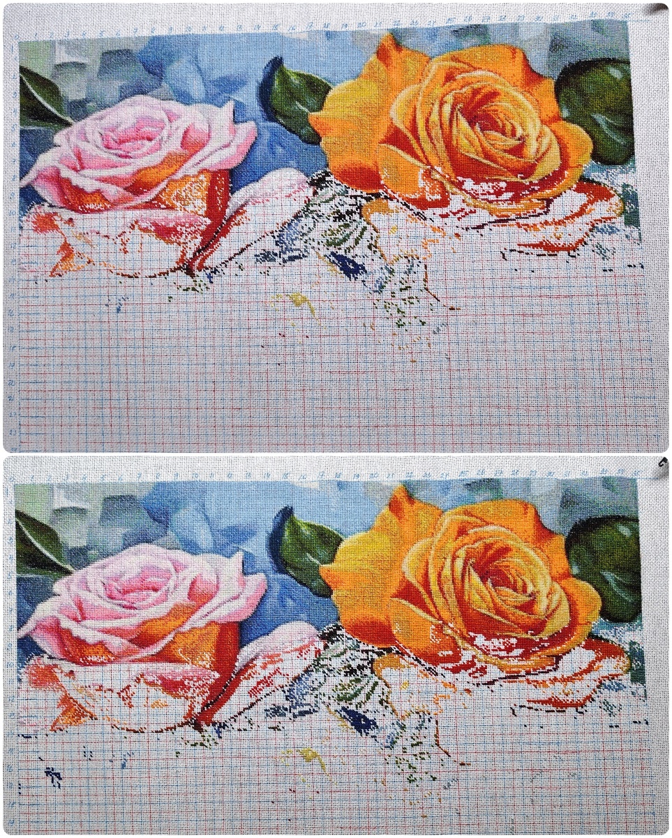 Вчера получила заряд цветотерапии на Розах. Добавилось 1029//. Было много оранжевого, красного. Потом переместилась на оттопыренный лепесточек и по вышивала немного светлыми. А дальше у нас пойдет листочек с зелеными оттенками. От листочка в этом ряду не много зеленых, там захватывается самый краешек. Плюс уже зашитого. Так что быстро проскочим и снова на оранжевые и красные, на вторую розу. И сегодня как раз рулетка велит оставаться на этом проекте. Ну я даже рада. Попала в цветной рай после пейзажа. Вообще, я люблю вышивать пейзажи, но зачастую в них мало цветов. Имею ввиду не в схеме, а именно цветов: голубой, зеленый да коричневый. Плюс все объекты крупные. То на небе долго зависнешь, то на деревьях, то на воде. Плюс каждый объект (кроме неба, пожалуй), вышивается сложно. В результате, я как-то быстро устаю от них. А вот так вышивать, когда пошил немного пейзаж, потом пошел зарядился на каком-нибудь детализированном сюжете, типа роз, мне очень даже нравиться. Ну что ж, сегодня прод