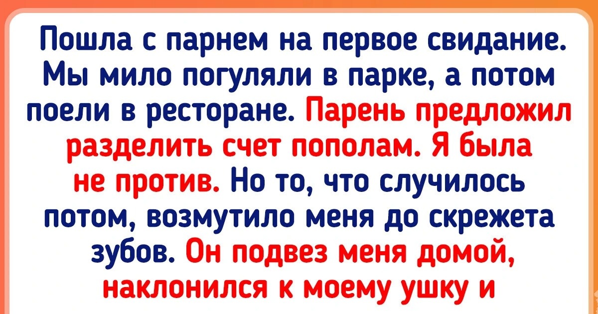 Мало кому нравятся скряги. Ведь иногда кажется, что они скупы не только на деньги, но и на эмоции. А бывают такие кадры, чья жадность превосходит все мыслимые пределы. Именно про таких людей и рассказали герои нашей подборки. Пошла с парнем на первое свидание. Мы мило погуляли в парке, а потом поели в ресторане. Парень предложил разделить счет пополам. Я была не против. Но то, что случилось потом, возмутило меня до скрежета зубов. Он подвез меня домой, наклонился к моему ушку и... попросил скинуть денег ему за бензин. Ведь он вез меня целых 8 км. Деньги отдала сразу же, но теперь этот парень искренне не понимает, почему я не хочу с ним общаться. Знакомый пригласил на свидание. Я ему говорю, мол, не против прогуляться, посидеть в парке или даже кофе выпить на заправке. Но тот настаивает, чтобы мы пошли в ресторан! Приходим, садимся. Я заказываю ризотто, а этот кадр внезапно достает котлеты в пакете и начинает их есть, так ничего себе и не заказав... Мне пришлось быстро доедать и валить