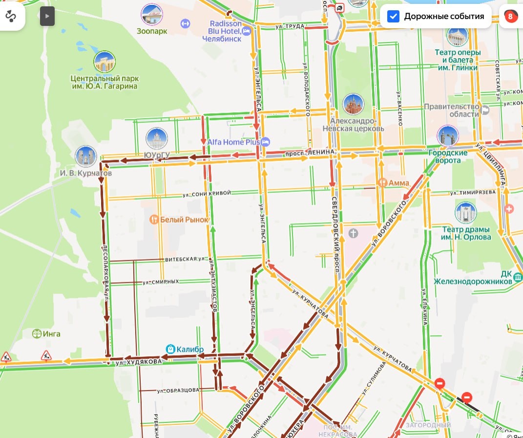 Намертво встали проспект Ленина, Лесопарковая и другие улицы в центре. В онлайн-картах водители пишут, что не видели такого всю зиму. Зато снежные кучи на Ленина убрали, не исключено, что техника переместилась куда-то дальше.