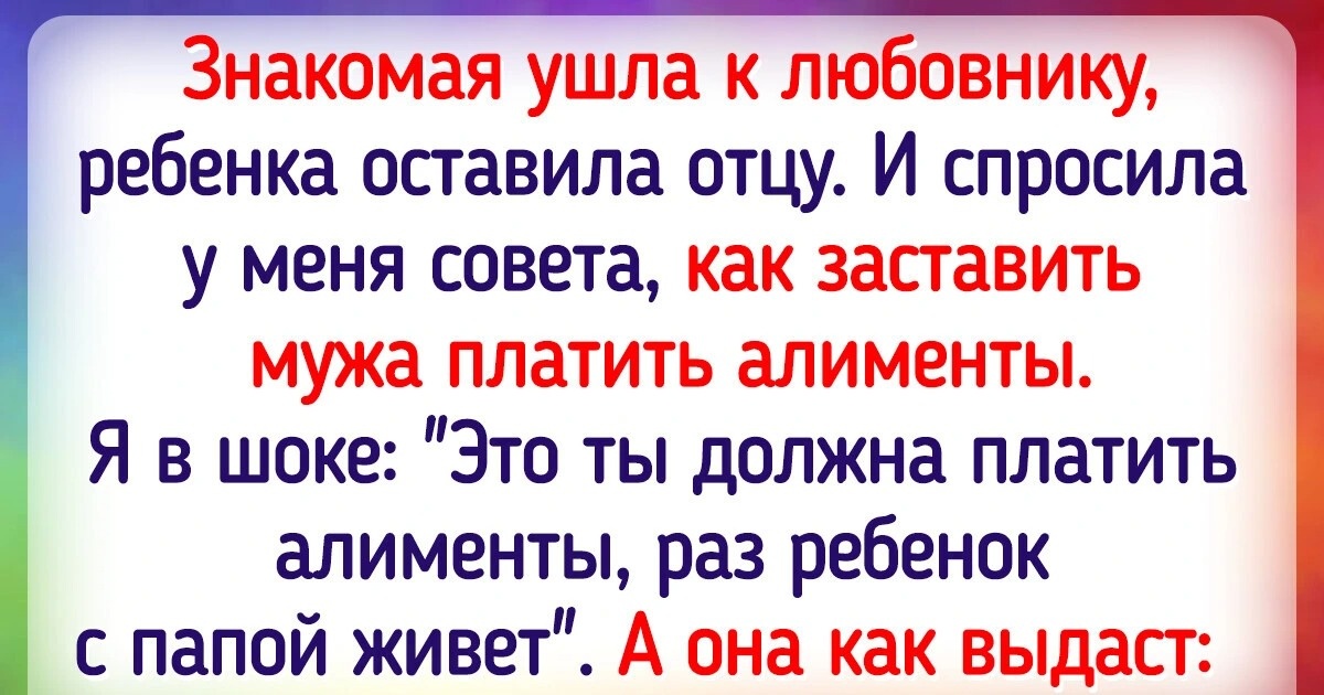 Знакомая ушла к любовнику, ребенка оставила отцу. И спросила у меня совета, как заставить мужа платить алименты. Я в шоке: «Это ты должна платить алименты, раз ребенок с папой живет». А она как выдаст: «У меня есть ребенок, я развожусь, значит, его отец должен мне алименты!» Так как сама она не работает, пришлось ей вернуться в семью. © FancyKonfeta / Pikabu