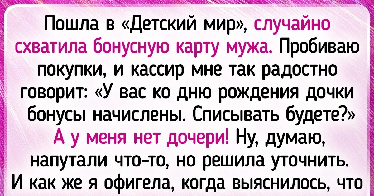 Пошла в «Детский мир», случайно схватила бонусную карту мужа. Пробиваю покупки, и кассир мне так радостно говорит: «У вас ко дню рождения дочки бонусы начислены. Списывать будете?» А у меня нет дочери! Ну, думаю, напутали что-то, но решила уточнить. И как же я офигела, когда выяснилось, что у мужа в карту вписаны два ребенка: наш сын 2013 года рождения и дочка Милана 2021. Так я и узнала о том, что у моего «благоверного» есть вторая семья. Подаю на развод.