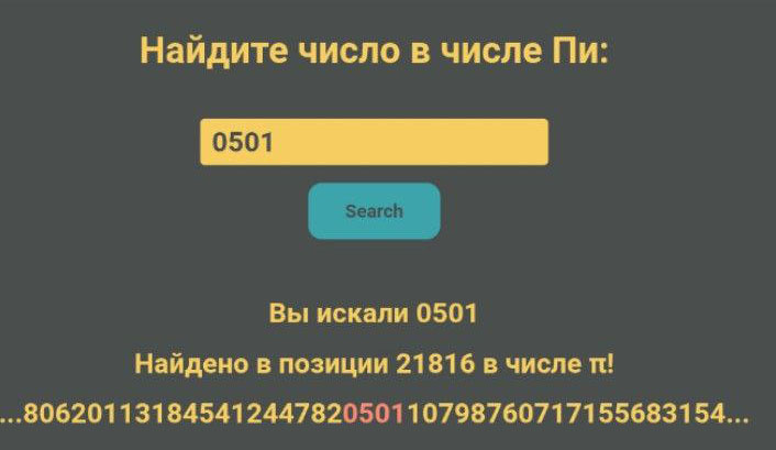 Знали, что существуют сайты, где можно найти любую последовательность цифр в числе Пи (дату рождения, номер телефона, код от домофона). Я нашёл там свою дату рождения (0501). Она встречается на 21816 позиции. Ссылку давать не буду, чтоб никто не подумал, что это реклама, но сайтов много, легко находятся поиском. Говорят, что в числе Пи есть ответы на все вопросы, все тексты и всё, всё всё. Но как? Число Пи — отношение длины окружности к диаметру. Число это с разной степенью точности известно очень давно. Я об этом писал, не буду повторяться. Суть в том, что на данный момент известны первые 314 триллионов (или 3,14×10¹⁴) знаков числа π после запятой, и никакой периодичности не обнаружено. Именно эта бесконечность и отсутствие закономерностей породили завораживающую идею: если цифры Пи никогда не заканчиваются и распределены случайным образом, то рано или поздно в них должна встретиться любая мыслимая комбинация цифр. Эта мысль настолько сильна, что нашла отражение в культуре. В романе