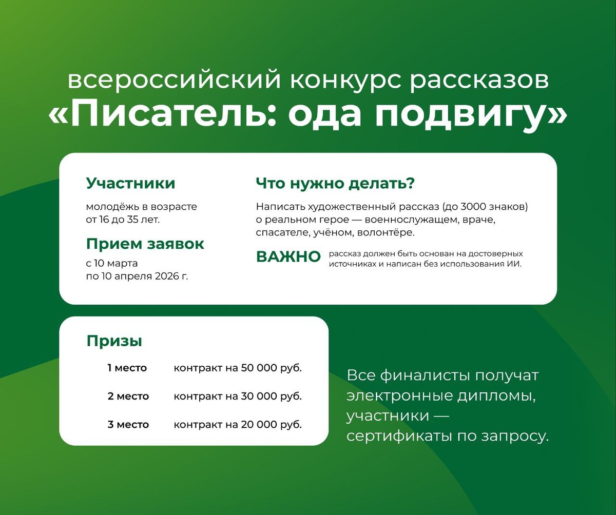 » Национальный центр информационного противодействия терроризму и экстремизму в образовательной среде и сети Интернет при поддержке Минобрнауки России запускает конкурс художественных рассказов «Писатель: ода подвигу» в рамках проекта по сохранению исторической памяти «Подвиг.РФ». Участники: молодёжь в возрасте от 16 до 35 лет. Приём заявок: с 10 марта по 10 апреля 2026 года. Что нужно сделать? Написать художественный рассказ, до 3000 знаков, о реальном герое — военнослужащем, враче, спасателе, учёном, волонтёре. Важно: рассказ должен быть основан на достоверных источниках и написан без использования ИИ. Призы: 🥇 1 место — контракт на 50 000 руб. 🥈 2 место — контракт на 30 000 руб. 🥉 3 место — контракт на 20 000 руб. Все финалисты получат электронные дипломы, участники — сертификаты по запросу. Подробности и регистрация — на сайте ПОДВИГ.РФ, раздел «Конкурсы» #СПбГЛТУ #СПбГЛТУ_возможности 👻 МАХ | 📲 ВК | 📝 ДЗЕН
