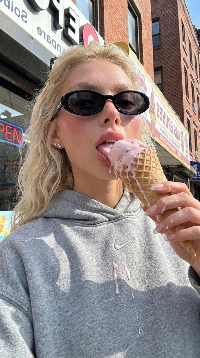 ИНСТРУКЦИЯ для создания такого фото: ✨ Отправь в бот https://t.me/aibudka_bot фото (лицо чётко видно). ✨ Выбери Nano Banana Pro. ✨ Параметры: 2K, 9:16 (или любые). ✨ Вставь промпт (скопируй): Сохрани лицо с загруженного фото. Не меняй лицо. Сходство 100%. Селфи снизу вверх на фронтальную камеру, формат 9:16. Девушка на городской улице облизывает тающее клубничное мороженое в вафельном рожке — капли на пальцах. Блеск на губах, румянец. Чёрные очки Kurt Cobain. Серая оверсайз худи Nike с маленьким свушем, серебряные мини-серьги-гвоздики, прозрачный лак на аккуратных ногтях. Яркий летний дневной свет, размытые вывески магазинов за спиной. #иифотограф #иифото #иифотосессия