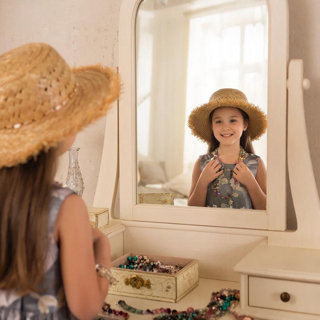В то утро Аня решила, что сегодня она должна быть самой красивой — ведь мамин праздник, и мама, может быть, придёт пораньше и увидит, какая у неё замечательная дочка. Она забежала в мамину комнату, надела на шею разноцветные бусы, а на голову — мамину соломенную шляпку с широкими полями. Крутанулась перед зеркалом, осталась очень довольна и вышла на улицу — гулять и показывать свою красоту.