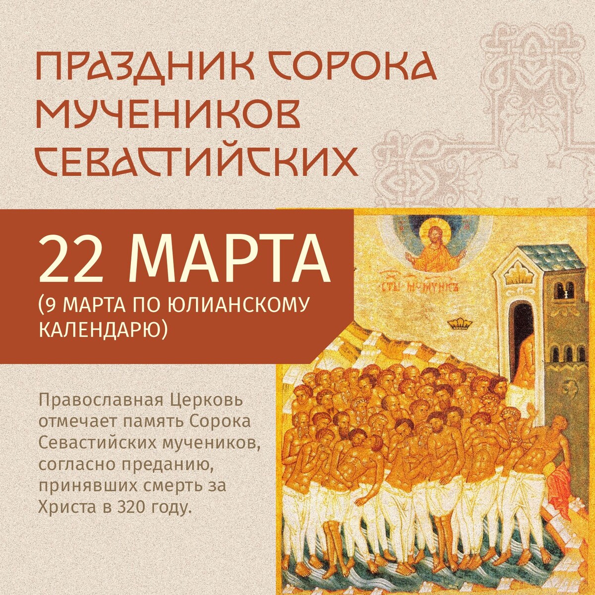 22 марта (9 марта по юлианскому календарю) Православная церковь отмечает день памяти Сорока Севастийских мучеников, согласно преданию, принявших смерть за Христа в 320 году.