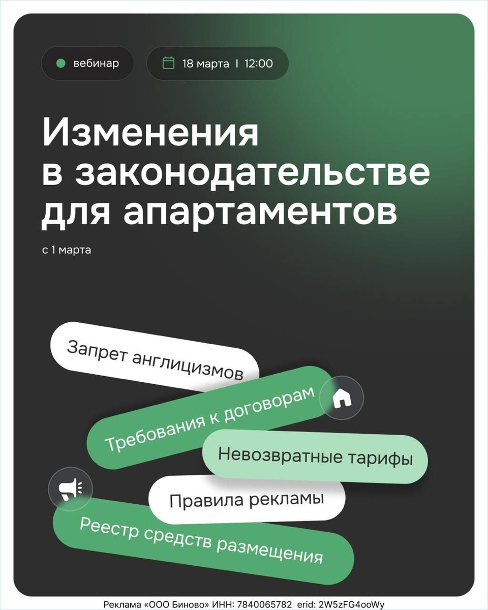 Для инвестиционной модели важен не только спрос, но и юридическая устойчивость объекта. С 1 марта 2026 правила работы с бронированием стали для рынка жестче: негарантированное бронирование исключено, возвратная логика поменялась, а условия отмены и возврата денег стали юридическим ядром отношений с гостем. Если тексты на сайте, в карточке или в договоре расходятся с новыми правилами, это уже вопрос не сервиса, а финансового риска. Проще говоря, неправильно оформленные условия брони сегодня — это потенциальные возвраты, споры и потери в доходности. 💡18 марта Bnovo проводит вебинар с юридическим разбором новых правил для гостиничного бизнеса и апартаментов. Спикер — Вадим Погорелов, руководитель юридического отдела «Байбородин и Партнеры». Это полезный эфир для тех, кто смотрит на объект как на актив и хочет заранее понять, где закон теперь влияет на деньги. 📆 18 марта | 12:00 👉 Регистрация на вебинар