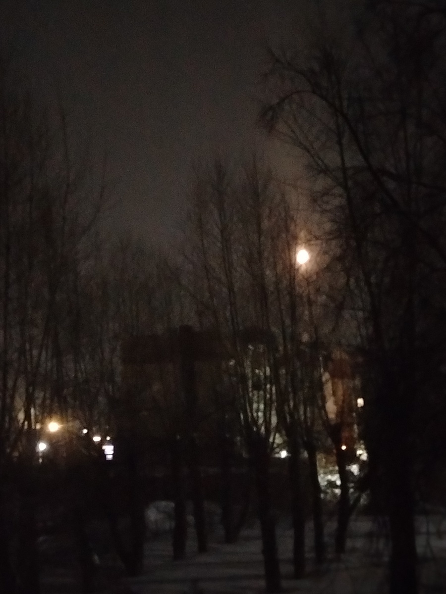 Чёрная мгла ночи, луна, тусклые фонари, всё в серо-чёрных тонах.