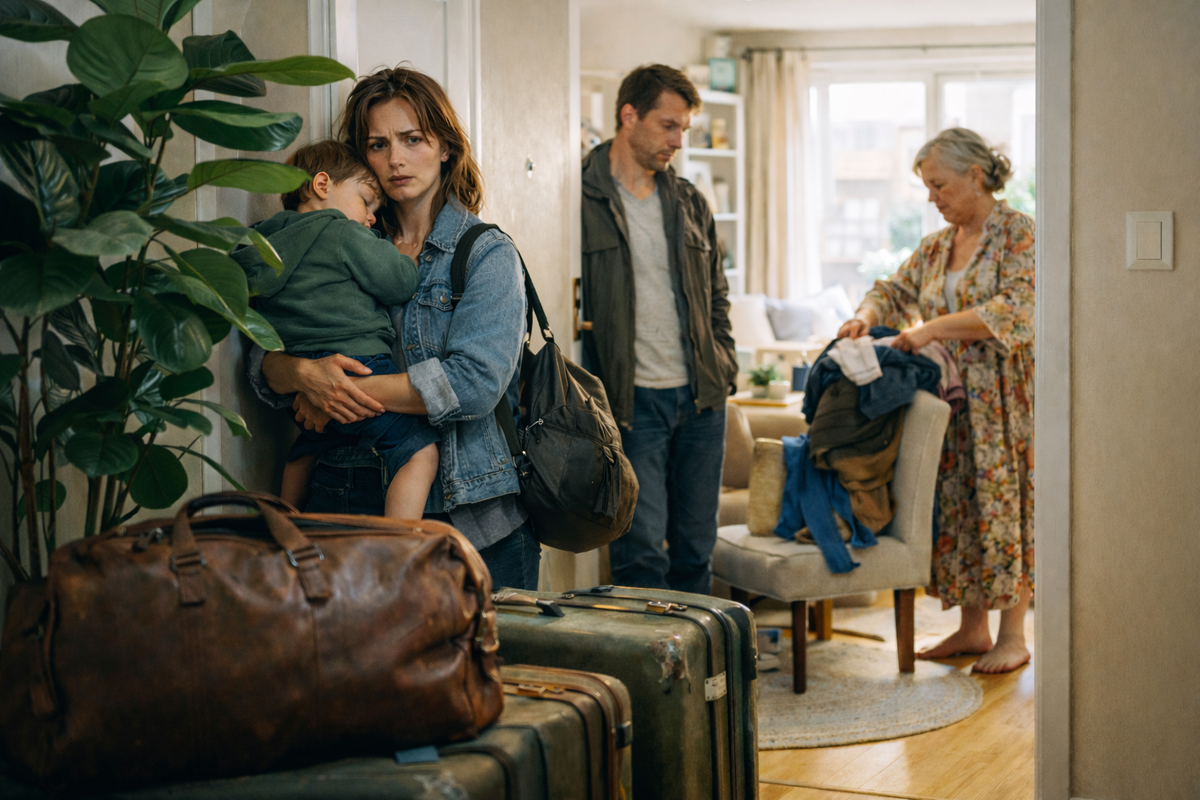 В прихожей стояли два огромных клетчатых баула, старый потертый чемодан на колесиках и чужая коричневая сумка с облезлой металлической молнией. На обувной полке, где обычно стояли её кроссовки и маленькие сандалии двухлетнего Артёма, теперь теснились чьи-то лакированные туфли, домашние тапки с мехом и резиновые галоши.