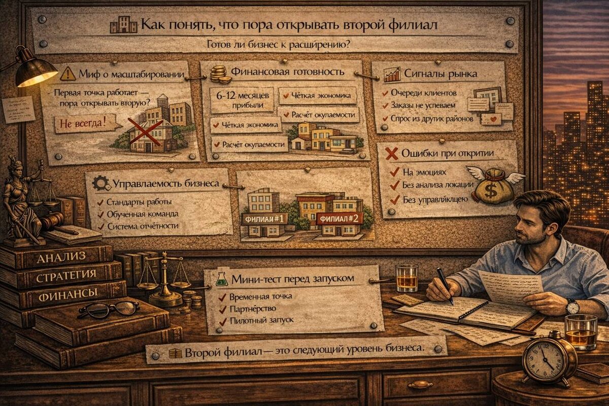 Расширение бизнеса — логичный этап роста. Но многие предприниматели открывают новые точки слишком рано. В результате появляется второй филиал, который начинает «съедать» прибыль первого. Поэтому важно понять: готов ли бизнес к масштабированию на самом деле. ⚠️ Мифы о масштабировании Один из распространённых мифов: «Если первая точка работает — пора открывать вторую.» На практике этого недостаточно. Первая точка может держаться на: — личном контроле собственника — сильном менеджере — случайном спросе — нестабильной экономике Если система не выстроена, проблемы просто копируются в новый филиал. 💰 Финансовые показатели готовности Перед открытием второй точки важно проверить цифры. Ключевые показатели: — стабильная прибыль минимум 6–12 месяцев — понятная экономика одной точки — прогноз окупаемости новой локации — финансовая подушка безопасности Если бизнес живёт «от месяца к месяцу», масштабирование становится опасным. 📈 Нагрузка на текущую точку Ещё один важный сигнал — перег